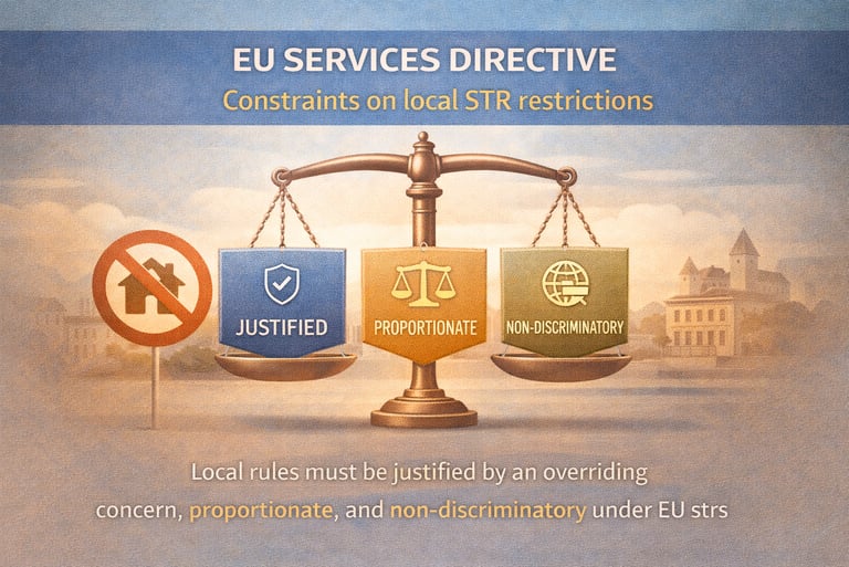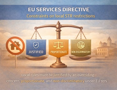 The Services Directive is one of the key EU legal guardrails for local STR regulation. It does not stop cities or Member States from imposing restrictions, but it requires those rules to be justified, proportionate, and non-discriminatory. In practice, this means licensing systems, authorization schemes, or other limits on STRs must be defensible under EU single-market law. The Cali Apartments case confirmed that such rules can be lawful where they genuinely pursue objectives like tackling housing shortages.