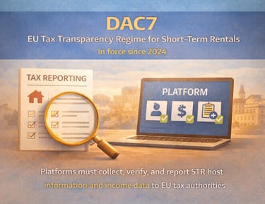 DAC7 is the EU’s tax transparency regime for digital platforms. It requires platforms facilitating activities such as the rental of immovable property to collect, verify, and report information about sellers and hosts to tax authorities. It is not a new tax, but it significantly increases reporting obligations and strengthens tax enforcement around STR income. The first exchange of reported information for the 2023 calendar year took place in February 2024.