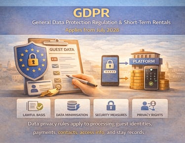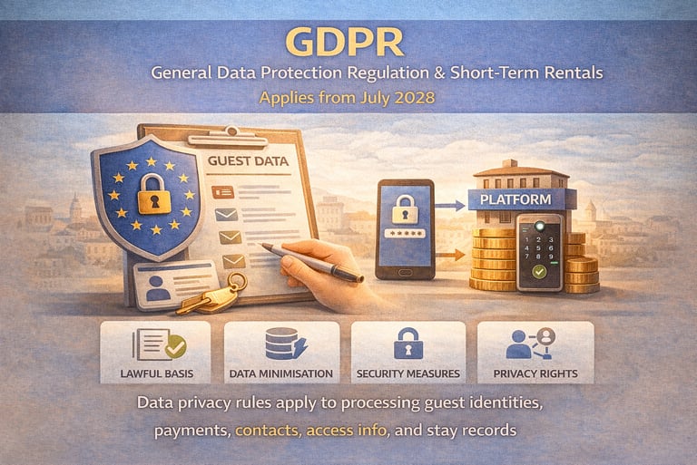 GDPR governs how personal data is collected, used, stored, and shared across the EU. In the STR context, it affects hosts, property managers, and platforms handling guest identities, contact details, payment data, booking records, and access information. It is a core part of the regulatory framework because STR activity today is deeply digital and data-driven.
