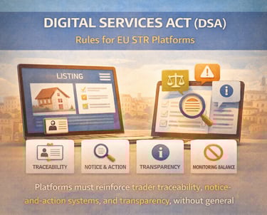 The DSA shapes how online STR platforms operate in the EU. It reinforces rules on platform accountability, transparency, notice-and-action systems, and trader traceability, while also preserving the principle that platforms are not subject to a general monitoring obligation. For short-term rentals, this matters because platforms must do more to structure information responsibly, without being turned into universal policing bodies for every listing.