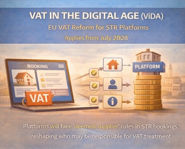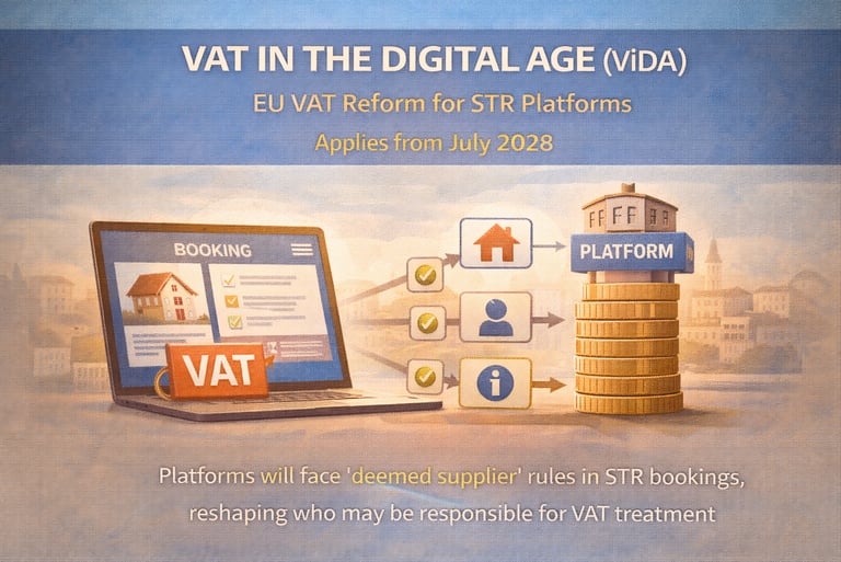 ViDA is a major EU VAT reform with direct consequences for platform-based short-term rentals. Under the package adopted in 2025, new “deemed supplier” measures will apply from 1 July 2028 to platforms active in short-term accommodation rental, changing who may be responsible for collecting and remitting VAT in certain transactions. In practical terms, this reform is set to reshape the VAT treatment of online STR bookings across the EU.