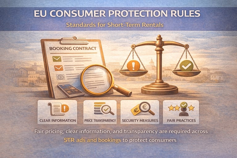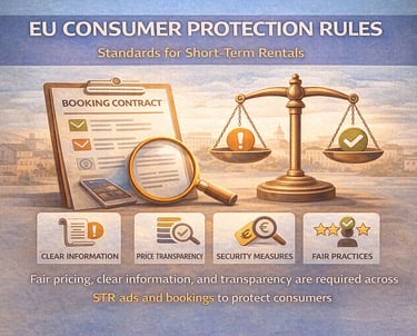 EU consumer law is highly relevant to short-term rentals, especially where bookings are made online. The Consumer Rights Directive and Unfair Commercial Practices Directive require fair information, transparency before purchase, and protection against misleading or unfair practices. For STRs, this affects how listings are presented, what information is given to guests, and how providers communicate pricing, conditions, and service details.